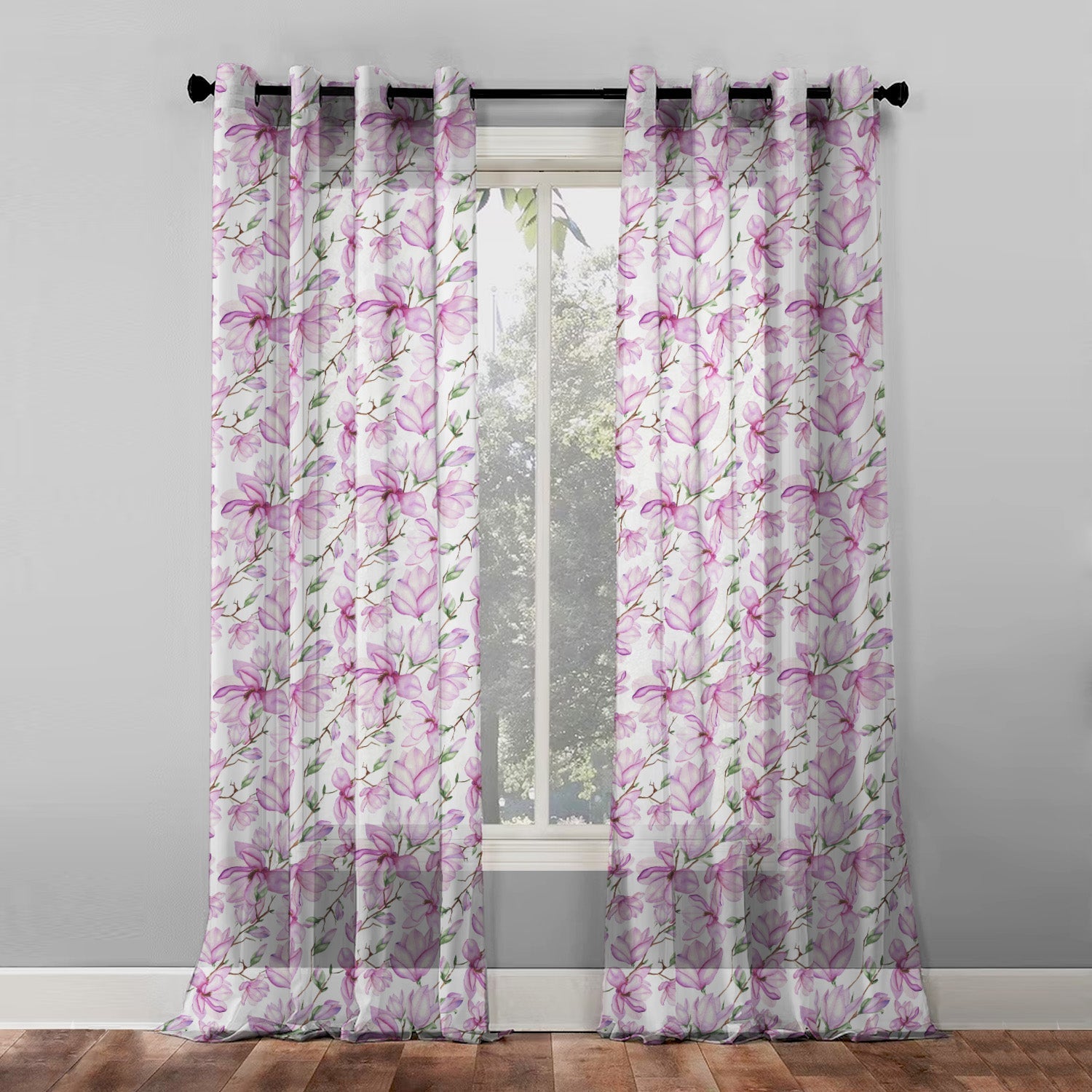 Elegant Floral Print Sheer Semi Transparent Curtain - Set of 2 -DS147A