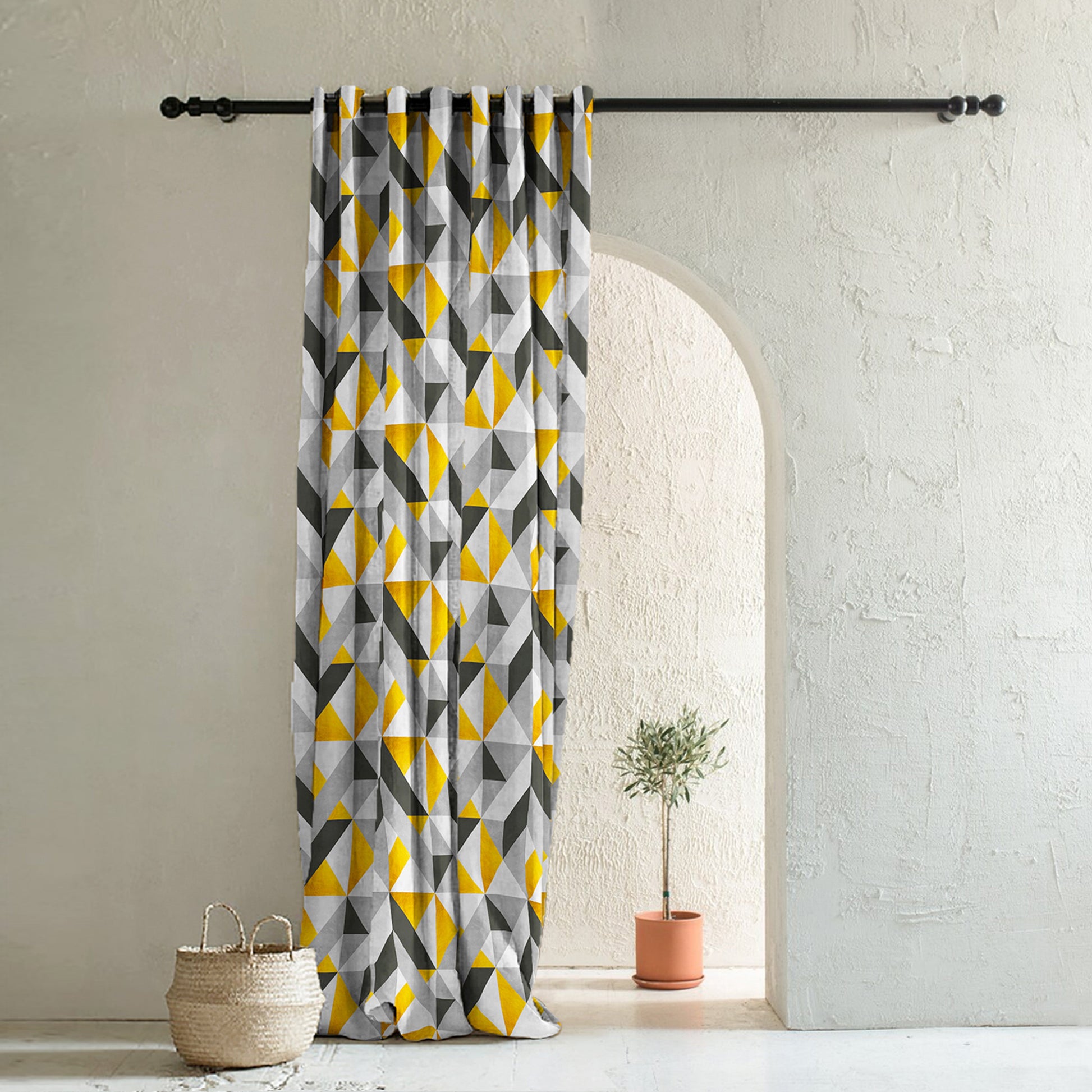 Shop our shape symphony geometric curtain in sunshine yellow online at Drape Story. These are room darkening curtains, available for all window & door sizes.