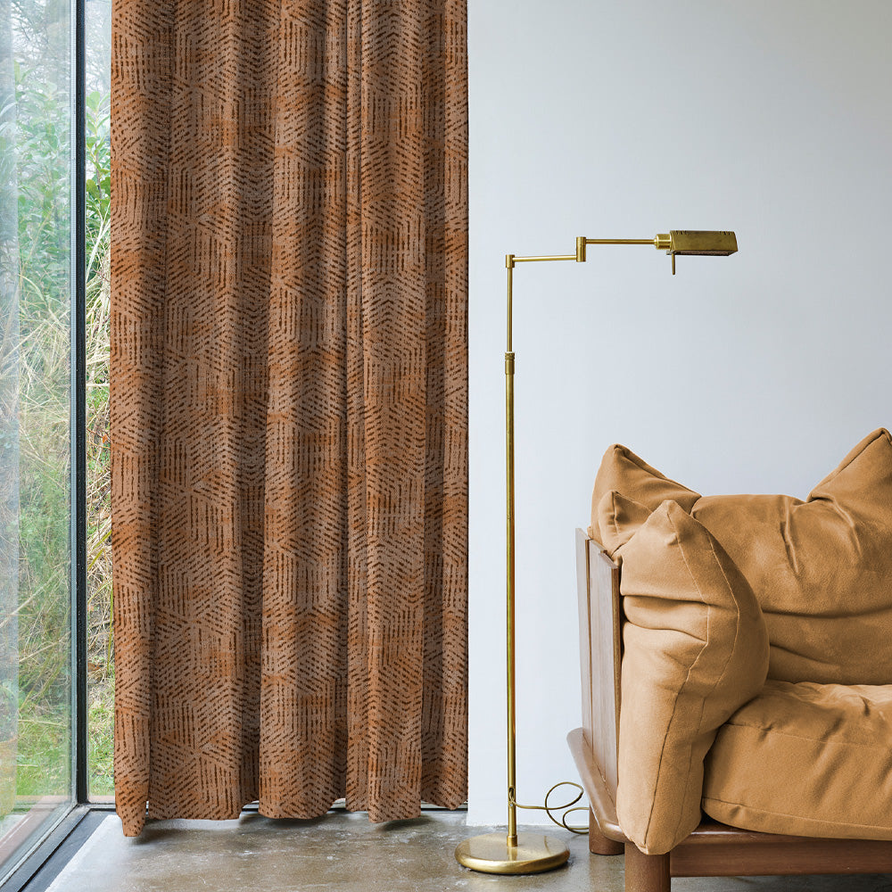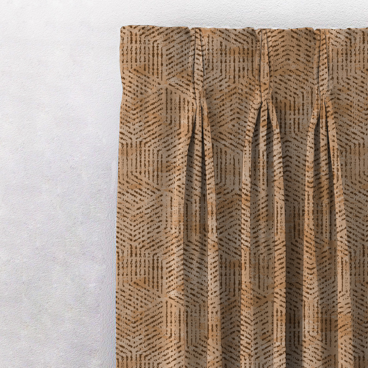 Shop our brokenhive geometric curtain in caramel brown online at Drape Story. These are room darkening curtains, available for all window & door sizes.
