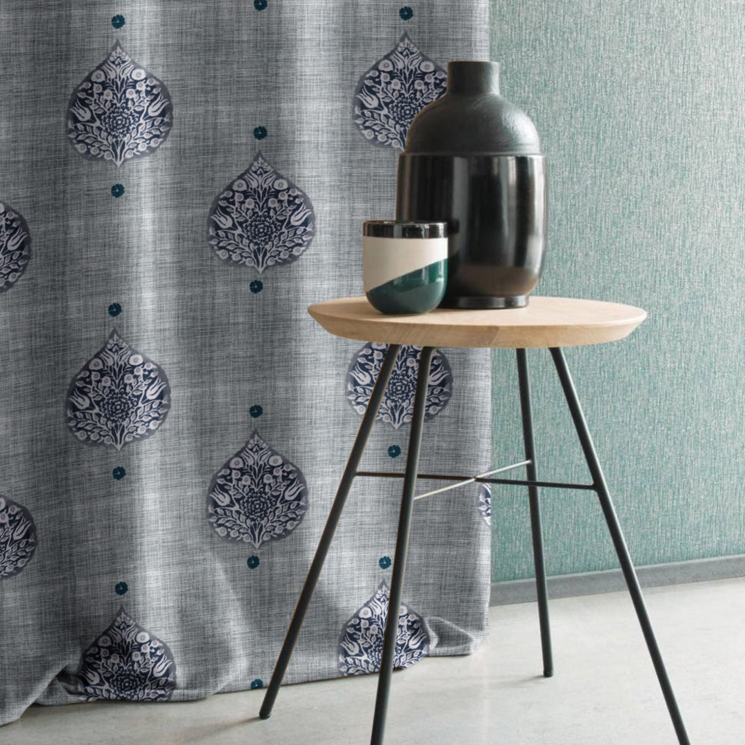 Shop our leafy charms indie curtains in navy blue online at Drape Story, These are heavy satin curtains available for all door & window sizes.