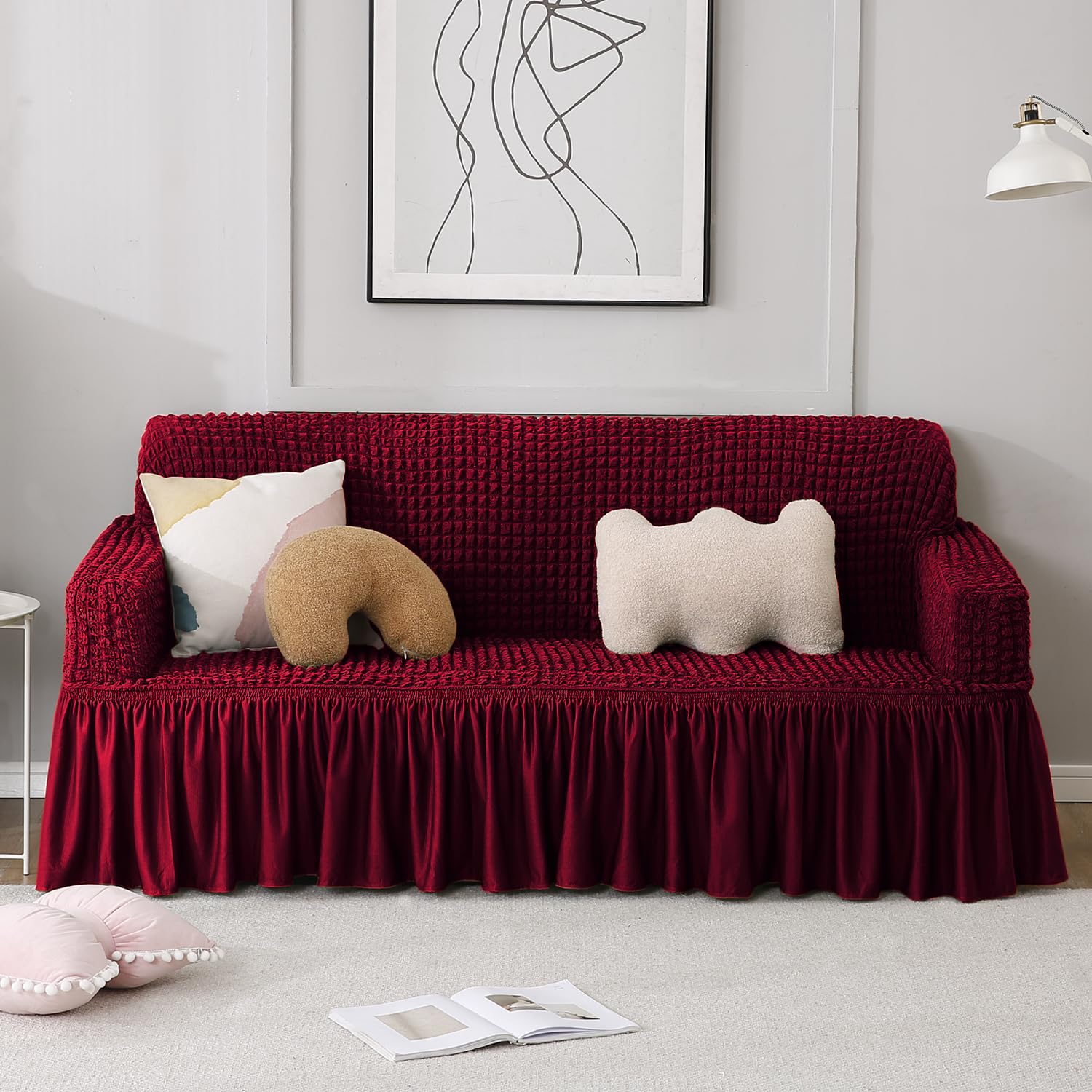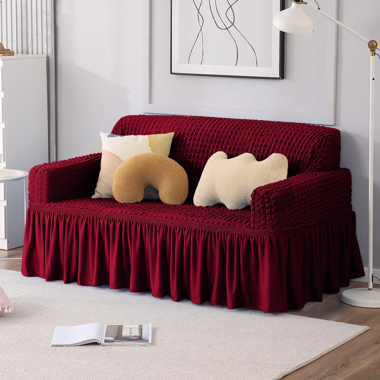Elastic Stretchable Bubble Sofa Cover with Frill, Wine
